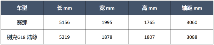 同样定位中大型MPV,以下是赛那和别克GL8陆尊的尺寸对比。